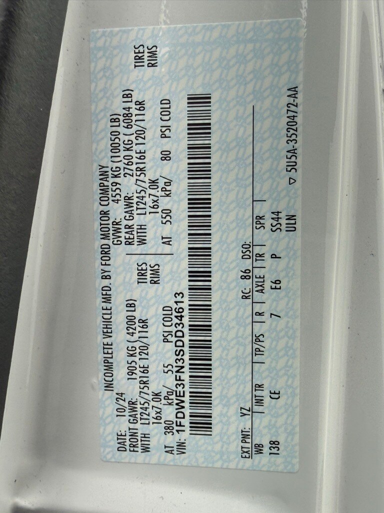 preferred equipment package 780a, standard trim, 7.3l v8 premium-rated engine, 4.10 limited slip axle xe6, high-series exterior upgrade package, power equipment group, rear view camera with mirror, raw materials surcharge, 10050# gvwr package, cruise control, mirrors manual trailer tow with power glass, frame pucks (isolators), 16x7 white painted steel wheels, tpms, cloth bucket seats, b-pillar trim kit, remote keyless entry/panic alarm