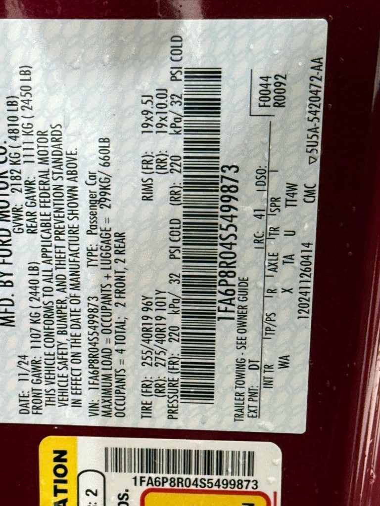 Molten Magenta Metallic Tri-Coat, 19x9.5F/10R Transd Dark-Painted Aluminum, 255F/275R/40R19 Summer Tire, Black Calipers w/White Logo, Recaro Seats, Hood Accent Stripe Delete, 10-Speed Automatic Transmission, 3.55 Torsen Rear Axle, Electronic Power Assist Steering, Engine Oil, Transmission, Differential Coolers, FordPass Connect 4G Wi-Fi, Independent Rear Suspension, Intelligent Access w/Push Button Start, Selectable Drive Modes, SiriusXM (Service Not Available in AK & HI), Strut Tower Brace w/Badge, SYNC4, Track Apps.