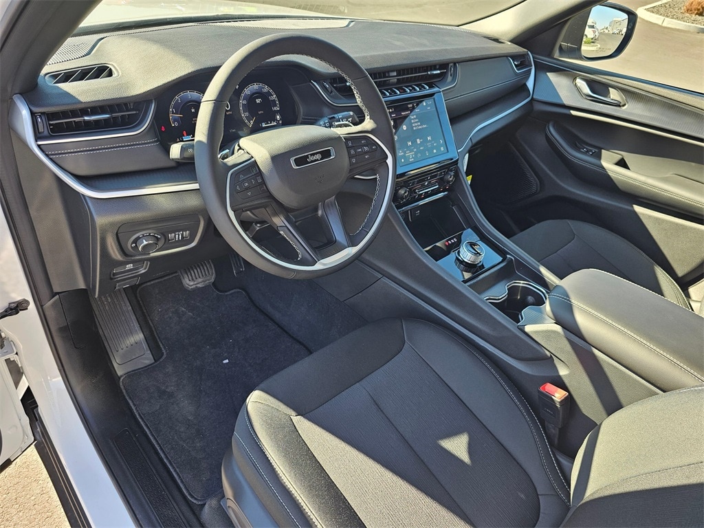 Interior: Cloth seats, 8.4 Uconnect touchscreen with 10.25 digital cluster, Apple CarPlay/Android Auto, SiriusXM 360L, Jeep Connect services, heated front seats and steering wheel, dual-zone climate control, full-function media hub with USB/aux ports, wireless charging, 2nd-row USB charge ports, 8-way power driver seat, 4-way manual front passenger seat, power liftgate, 115V auxiliary outlet, rain-sensitive windshield wipers.