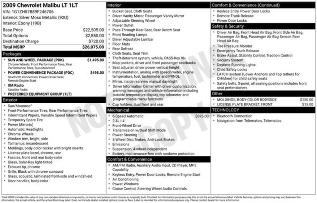 Ebony Cloth. Recent Arrival!22/33 City/Highway MPGAll vehicles are one of each. All Pre-Owned or Certified vehicles are Used. A dealer documentary service fee of up to $200 may be added to the sale price or capitalized cost. All financing is subject to credit approval. Prices exclude tax, title, and license and are valid for Washington residents only. All transactions are negotiable including price, trade allowance, interest rate (of which the dealer may retain a portion), term, and documentary service fee. Any agreement is subject to execution of contract documents. Every reasonable effort is made to ensure the accuracy of this data. Please verify any information in question with a dealership sales representative. At Bill Pierre Chevrolet, we service not only the Seattle area Chevrolet customer needs, but also the entire state of Washington and beyond. Our customers come from Seattle, Bremerton, Bellevue, Everett, Wenatchee, Arlington, Burlington, Marysville, Lynnwood, Tacoma, and more.Awards:* 2009 KBB.com Best 10 Family VehiclesReviews:* The 2009 Chevrolet Malibuâs bold, attractive sheetmetal and stylish interior touches are backed by confident handling, a quiet ride and an overall level of refinement competitive with the categoryâs best. Unlike some competitors, the fuel-efficient four-cylinder engine is available on all Malibu trims, not just the entry-level model. Source: KBB.com