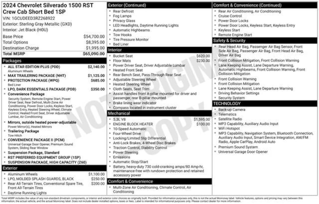 Clean CARFAX!Elevate your drive with the 2024 Chevrolet Silverado 1500 RST, a rugged and refined pickup that blends power, capability, and sophisticated technology. This Silverado is equipped with an impressive EcoTec3 5.3L V8 engine mated to a smooth-shifting 10-speed automatic transmission, delivering a commanding 4WD driving experience.- Standout features include:- Bose 7-speaker premium audio system- Dual-zone automatic climate control- Heated steering wheel and front seats- Wireless charging- Trailering package with integrated brake controllerThe Silverado's striking exterior is enhanced by the bold RST styling, with a black grille, mirror caps, and tailgate lettering. Step inside the spacious cabin and discover the premium Cloth seat trim, 12.3 digital instrument cluster, and a wealth of advanced driver assistance technologies like Forward Collision Alert and Lane Keep Assist.Whether hauling heavy payloads or towing your toys, the Silverado 1500 RST delivers exceptional capability. The All-Star Edition Plus package adds a high-capacity suspension, electronic locking rear differential, and trailer brake controller for confident towing up to 13,300 lbs. And with an EPA-estimated 20 mpg highway, this Silverado balances brawn and efficiency.Experience the uncompromising performance, premium features, and rugged good looks of the 2024 Chevrolet Silverado 1500 RST. Schedule a test drive today and discover why this pickup is the perfect blend of work and play.All vehicles are one of each. All Pre-Owned or Certified vehicles are Used. The offering price of this vehicle is conditioned on a negotiated waiver of implied warranties if the Buyers Guide on the vehicle is AS IS-NO DEALER WARRANTY. If the Buyers Guide on the vehicle is IMPLIED WARRANTIES ONLY, the offering price includes implied warranties. A dealer documentary service fee of up to $200 may be added to the sale price or capitalized cost. All financing is subject to credit approval. Prices exclude tax, title, and license and are valid for Washington residents only. All transactions are negotiable including price, trade allowance, interest rate (of which the dealer may retain a portion), term, and documentary service fee. Any agreement is subject to execution of contract documents. Every reasonable effort is made to ensure the accuracy of this data. Please verify any information in question with a dealership sales representative.