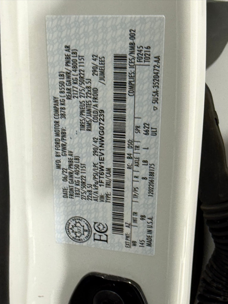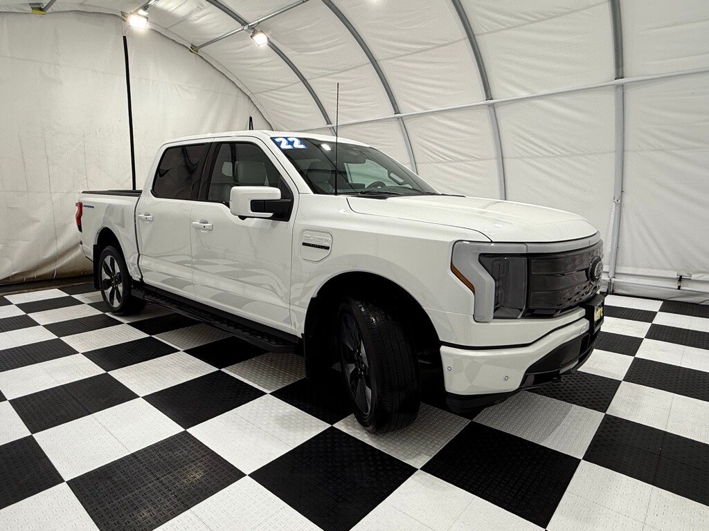 **2022 Ford F-150 Lightning Platinum eAWD ** Star White Metallic Tri-Coat ($795) ** Equipment Group 710A Platinum ** Extended Range Battery Dual eMotor ** 22" Bright Machined w/ Ebony Black Wheels ** Premium Nirvana Leather Bucket Seats ** Ford Charge Station Pro ** SYNC 4A w/ Enhanced Voice Recognition ** B&O Unleashed Sound System ** On-Board Scales & Smart Hitch Removal Credit (-$650) ** Tray Style Floor Liner ($200) ** 8,550-lb GVWR ** EPA-rated 78 MPGe city / 63 MPGe highway / 70 MPGe combined ** EPA-est. range up to 300 miles (Platinum ER) new MSRP was $93,014.