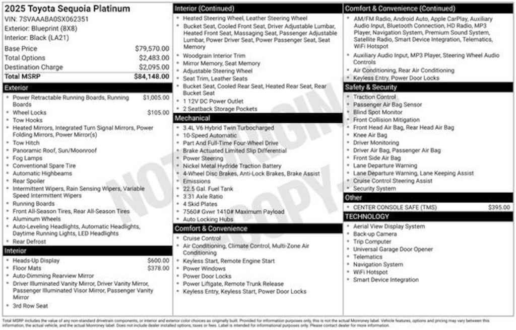 Step inside the Sequoia Platinum and be captivated by the premium leather seating, heated and ventilated front and rear seats, and a panoramic moonroof that floods the cabin with natural light. The advanced technology suite, including the 14-speaker JBL premium audio system and the intuitive Toyota Audio Multimedia interface, ensures you'll enjoy every mile of your journey.